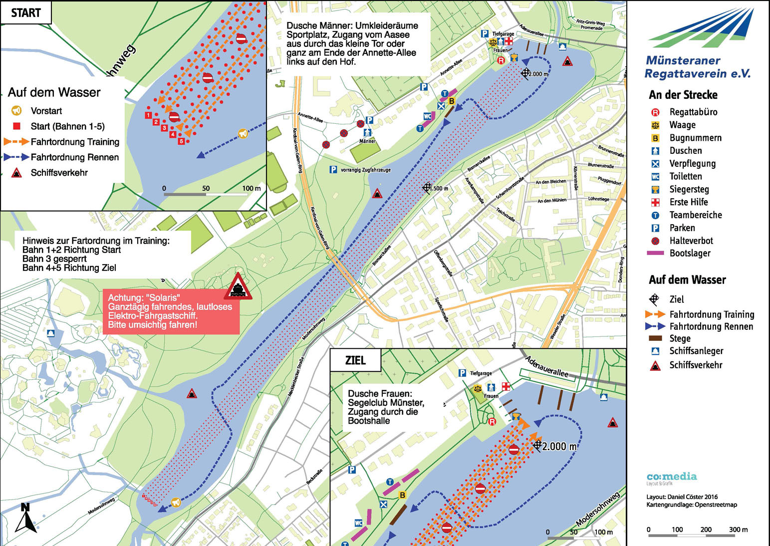 Die nachfolgende Regattakarte stellt die Regelstrecken von 2000 (Senioren, Junioren-A), 1500 (Junioren-B) sowie 1000 Meter (Masters) dar. Für Sprintregatten werden jeweils individuelle Regattakarten veröffentlicht.